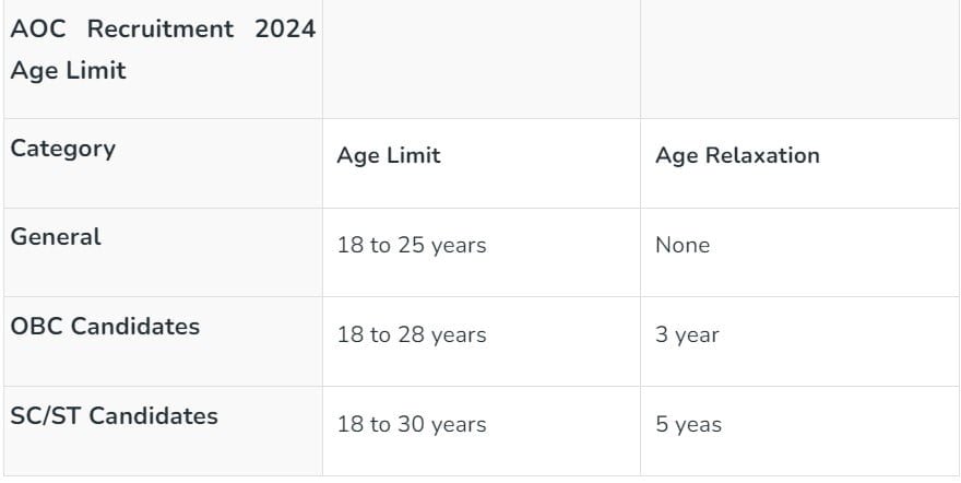 आर्मी ऑर्डनेंस कॉर्प्स भर्ती 2024 के लिए आवेदन करने वाले सभी उम्मीदवारों को पात्रता मानदंडों के लिए शैक्षिक योग्यता तथा आयु सीमा समन्धित शर्तो को पूर्ण करना होगा। इन सभी पात्रता की शर्तो का निर्धारण Army Ordnance Corps(AOC) विभगा के द्वारा किया गया है। यदि कोई उम्मीदवार पात्रता की शर्तो को पूर्ण नहीं कर सकता है तो ऐसी स्थिति में उस उम्मीदवार के आवेदन फॉर्म को Army Ordnance Corps(AOC) विभाग के द्वारा रद्द कर दिया जाएगा ।