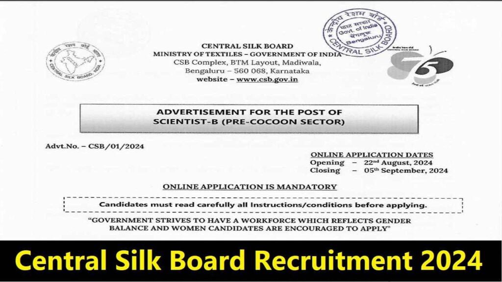 Central Silk Board Recruitment 2024– The Central Silk Board (CSB) under the Ministry of Textiles केंद्रीय रेशम बोर्ड के तहत नौकरी की तलाश कर रहे सभी योग्य उम्मीदवारों के लिए गुड न्यूज, हाल ही में केंद्रीय कपड़ा मंत्रालय, भारत सरकार के तहत केंद्रीय रेशम बोर्ड (CSB) 122 वैज्ञानिक-बी (प्री-कोकून सेक्टर) पदों के लिए भर्ती अधिसूचना को जारी किया है।