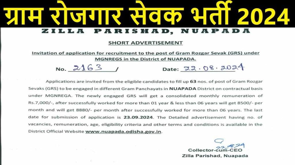 Gram Rozgar Sevak GRS Recruitment 2024– जिला परिषद नुआपाड़ा, ओडिशा ने नुआपाड़ा जिले की विभिन्न ग्राम पंचायतों में नियुक्त किए जाने वाले ग्राम रोजगार सेवकों (जीआरएस) के 63 पदों को भरने के लिए पात्र उम्मीदवारों से आवेदन आमंत्रित किए हैं। जिला परिषद नुआपाड़ा ग्राम रोजगार सेवक भर्ती 2024 आवेदन प्रक्रिया ऑफ़लाइन है।