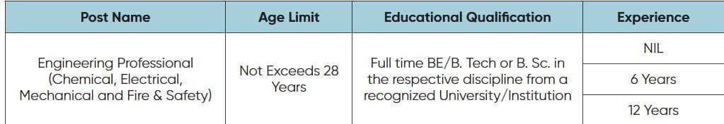 • इंजीनियरिंग प्रोफेशनल (केमिकल, इलेक्ट्रिकल, मैकेनिकल और फायर एंड सेफ्टी) आदि पदों के लिए आवेदन करने वाले सभी उम्मीदवारों को कम से कम 6 वर्ष से 12 वर्ष तक का अनुभव तथा पूर्णकालिक बीई/बी. टेक या बी.एससी. किसी मान्यता प्राप्त विश्वविद्यालय/संस्थान से डिग्री प्राप्त किया होना अनिवार्य है |