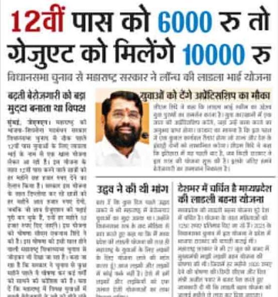 लाडला भाई योजना के माध्यम से महाराष्ट्र राज्य सरकार के द्वारा राज्य के 12वीं पास छात्रों को 6000 रुपये प्रति माह, डिप्लोमा धारकों को 8000 रुपये प्रति माह और स्नातकों को 10000 रुपये प्रति माह आर्थिक सहायता प्रदान की जाएगी।