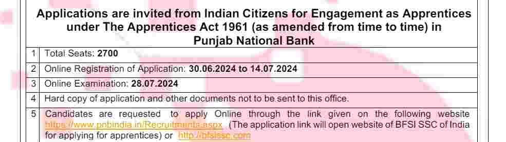 सभी उम्मीदवारों को सूचित किया जाता है की Punjab National Bank Recruitment 2024 के लिए भर्ती अधिसूचना को पंजाब नेशनल बैंक / PNB के द्वारा अपनी अधिकारिक वेबसाइट www.pnbindia.in पर जारी कर दिया है। वे सभी उम्मीदवार जो PNB में अपरेंटिस पदों पर नौकरी प्राप्त करने का सपना रखते है। ऐसे सभी उम्मीदवारों को PNB के द्वारा ऑनलाइन आवेदन करने को आमंत्रित किया जाता है।