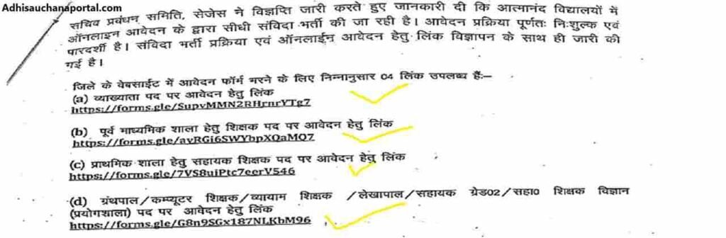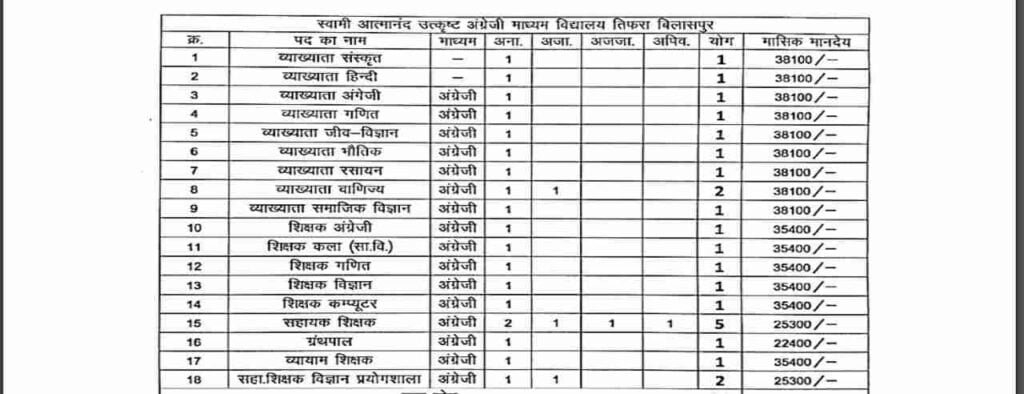 विद्यालयवार रिक्त पदों पर संविदा नियुक्ति हेतु निर्धारित आर्हता (योग्यता) रखने वाले इच्छुक एवं पात्र आवेदकों से दिनांक 21/08/2024 से 06/09/2024 की रात्रि 11:59 बजे तक ऑनलाईन आवेदन जिले के वेवसाईट https://bilaspur.gov.in पर आमंत्रित किये जाते है।
