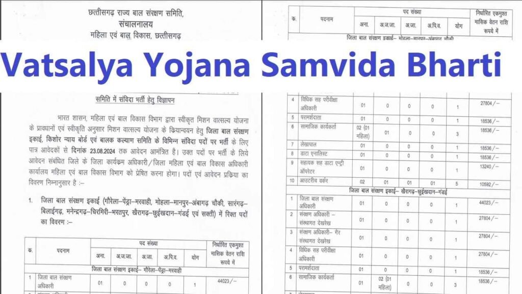 Vatsalya Yojana Samvida Bharti 2024– छत्तीसगढ़ राज्य बाल संरक्षण समिति एवं महिला एवं बाल विकास, छत्तीसगढ़ के द्वारा हाल ही में विभिन्न जिलों में वात्सल्य योजना संविदा भर्ती 2024 के लिए अधिकारिक अधिसूचना को जारी किया है।और इच्छुक उम्मीदवारों को आवेदन करने के लिए आमंत्रित किया है।